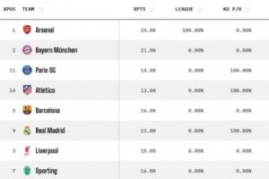 欧冠夺冠概率:枪手36%居首,拜仁巴黎分列二三,巴萨皇马红军5-7